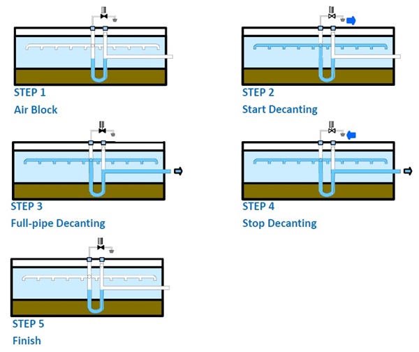 Fixed or Floating Decanter. Because our system is valve less it can’t jam, close or otherwise fail, interfering with the decant. But we still offer plenty of control over the decant. When th SBR water level reached the operator selected bottom water level, atmospheric air breaks the siphon stopping all decant flow. Decanting makes it virtually impossible to discharge untreated waste water into treated clean water.